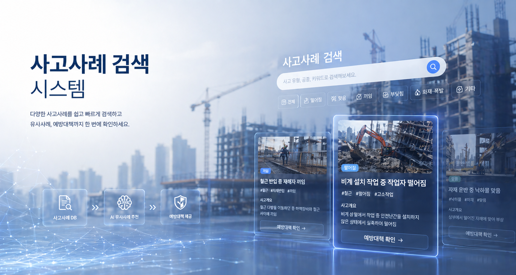 월요일 아침 TBM 직전 '오늘 개구부 인근 철근 작업' 을 입력하면, 동종 작업에서 발생한 추락 사례와 차단 포인트가 정리되어 작업자에게 즉시 공유할 수 있습니다.